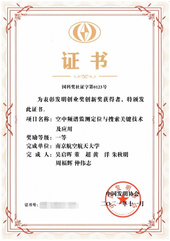 2021年11月,我校副校长吴启晖教授牵头、董超教授、黄洋副教授、朱秋明教授、周福辉教授与仲伟志副教授参与的项目“空中频谱监测定位与搜索关键技术及应用”在中国发明协会2021年度“发明创业奖—创新奖”评选中获发明创业奖创新奖一等奖。