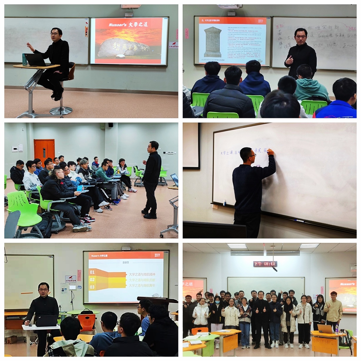 新生成长互动沙龙由学院党委书记石勇担任主持和主讲人,与新生们通过话题引入、共同探究、情景表达等形式展开讲述和对话,共同探讨“Nuaaer’s 大学之道”。互动沙龙首先从“大学之道与南航精神”视角阐释了《大学》三纲八目和南航精神谱系(校训、校风、办学精神)的联结与传承,其次从“南航速度、南航高度、南航温度”三个方面展现了“大学之道与南航贡献”的内在逻辑,最后立足于习近平总书记对青年的嘱托和南航人才培养目标明确了“大学之道与南航青年”这一主题,让新生能深刻理解在大学学习的目标和任务,从而开始主动行动起来。