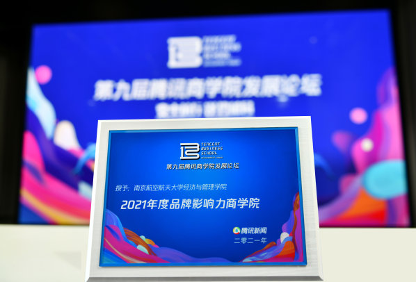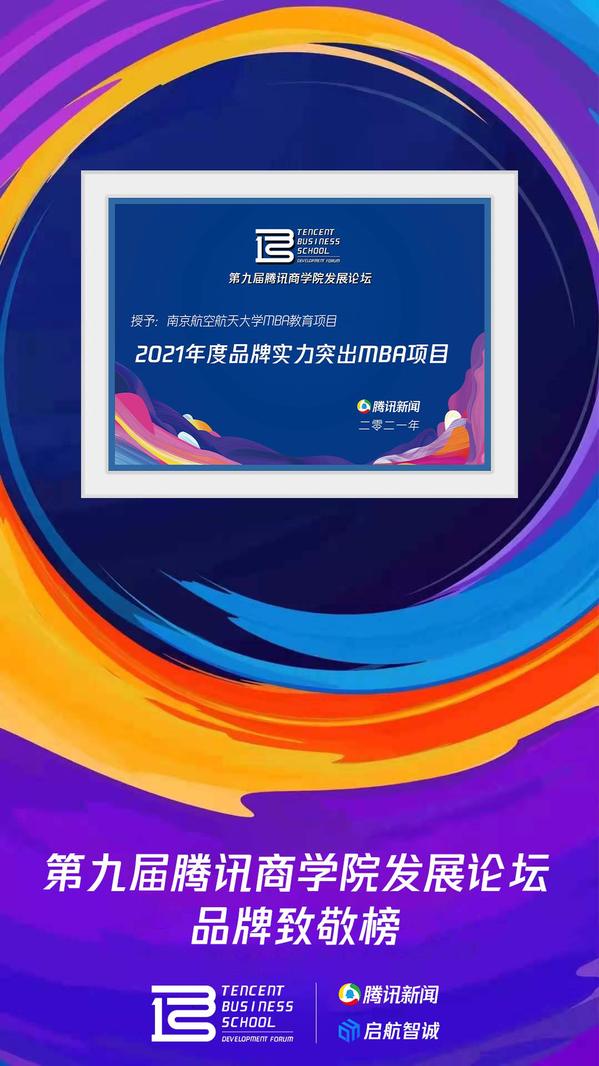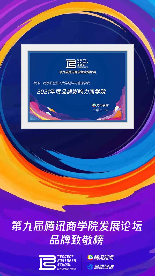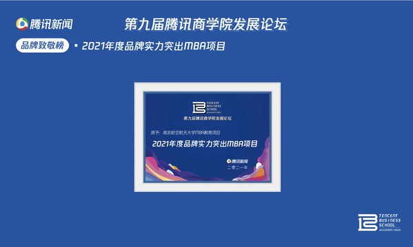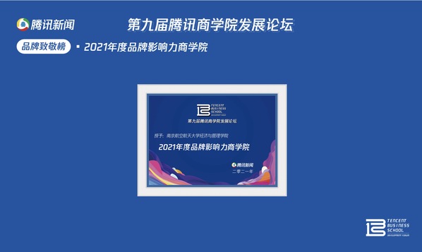 同时,为进一步传递行业前沿思想,腾讯商学院致敬商科教育领域内的优秀头部力量,论坛现场还颁发了2021年度中国商科教育影响力人物、2021年度品牌影响力商学院、2021年度品牌实力突出MBA项目等多类荣誉奖项。南京航空航天大学经济与管理学院荣获“2021年度品牌影响力商学院”,南京航空航天大学MBA教育项目荣获“2021年度品牌实力突出MBA项目”。