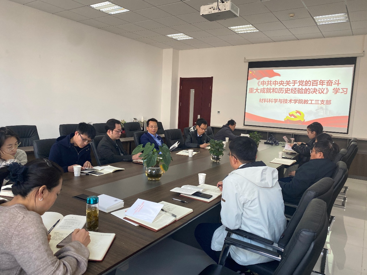 12月10日上午,材料科学与技术学院教工三支部开展党的十九届六中全会决议精神学习,特邀校党委副书记刘宇雷莅临指导。