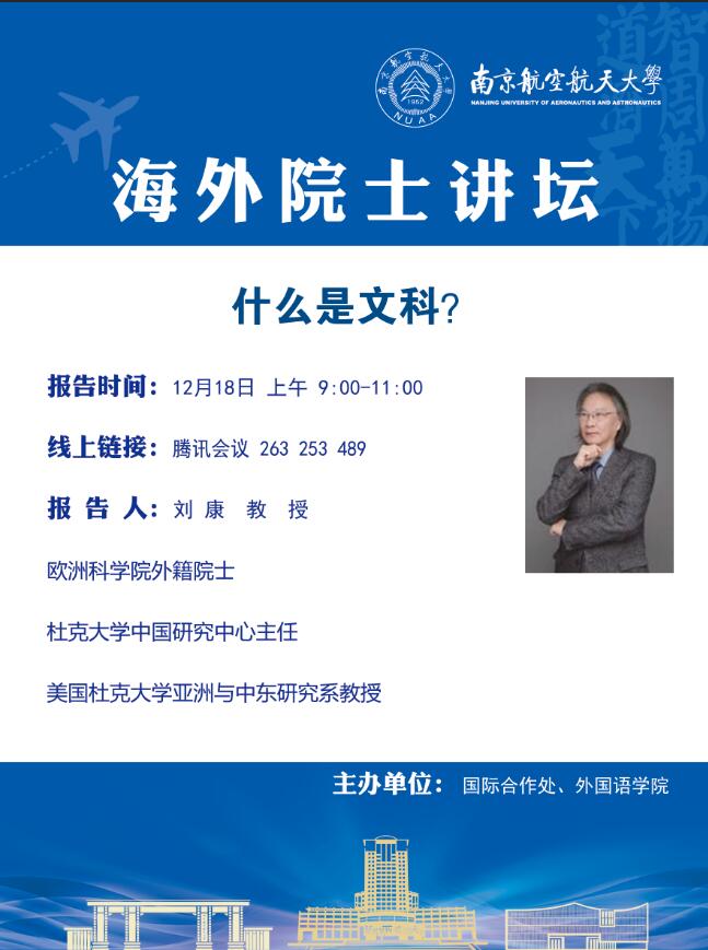 “海外院士讲坛”第十二期邀请到了欧洲科学院外籍院士、美国杜克大学亚洲与中东研究系教授、杜克大学中国研究中心主任刘康教授为师生们开讲。本次讲座将通过追溯文科(liberal arts)在欧洲现代知识模式中的谱系发展,进一步探讨现代中国知识体系与模式的西方来源与基础。讲座将在线上展开,欢迎各位师生莅临参与!