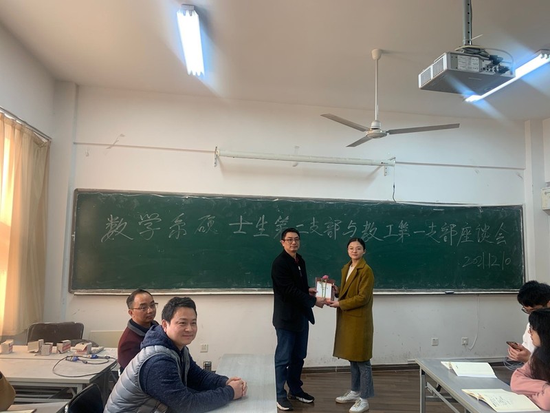 数学专业硕士生第二党支部与数学专业教工第一党支部开展“谈心谈话关爱月”师生座谈,教工党员给刚刚发展的预备党员和即将转正的学生预备党员赠送了书籍《中国共产党简史》,希望党员同学从党史学习中深入读懂政治信仰,争当伟大梦想的逐梦人。师生还就研究生期间的学习生活的各类问题进行了广泛交流。就徐江老师提出的科研建议,大家进行了讨论。廖洪林老师对此提出了宝贵的意见,认为学生可以以周志的形式与自己的导师进行交流,提出自己现阶段遇到的困难以及反映现阶段的研究进展情况,强调学生要珍惜时间。此外,老师们也对学生提出的职业选择的进行了一些建议,对学生反映的工作室情况进行汇总。