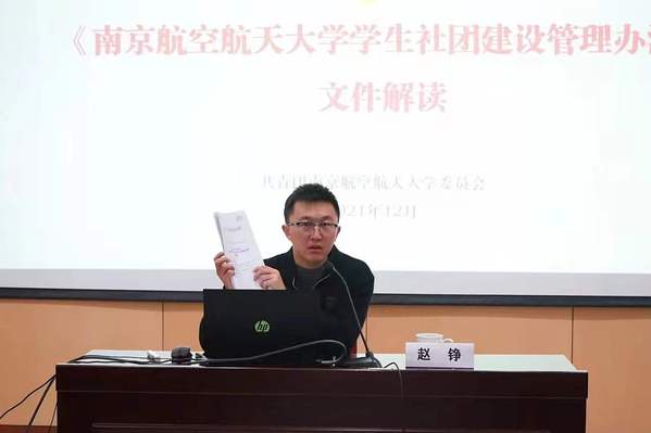 赵铮就《南京航空航天大学学生社团建设管理办法》进行解读,从学生社团基本任务、管理机构、注册考核、活动管理等七个方面为同学们进行了详细讲解,并对下一阶段学生社团工作进行了部署与展望,鼓励社团骨干严格要求自我、不断提升能力,以期更好地服务于学生社团的建设发展。