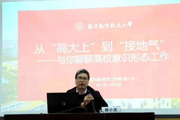 樊小杰以“从‘高大上’谈到‘接地气’——与你聊聊高校意识形态工作”为主题展开授课,围绕什么是意识形态工作、为何要重视意识形态工作、学生社团骨干应该怎么做三个层面做了深入浅出的解读,并寄语参训学员坚定理想信念,明确职责定位,迈稳步子,砥砺前行。