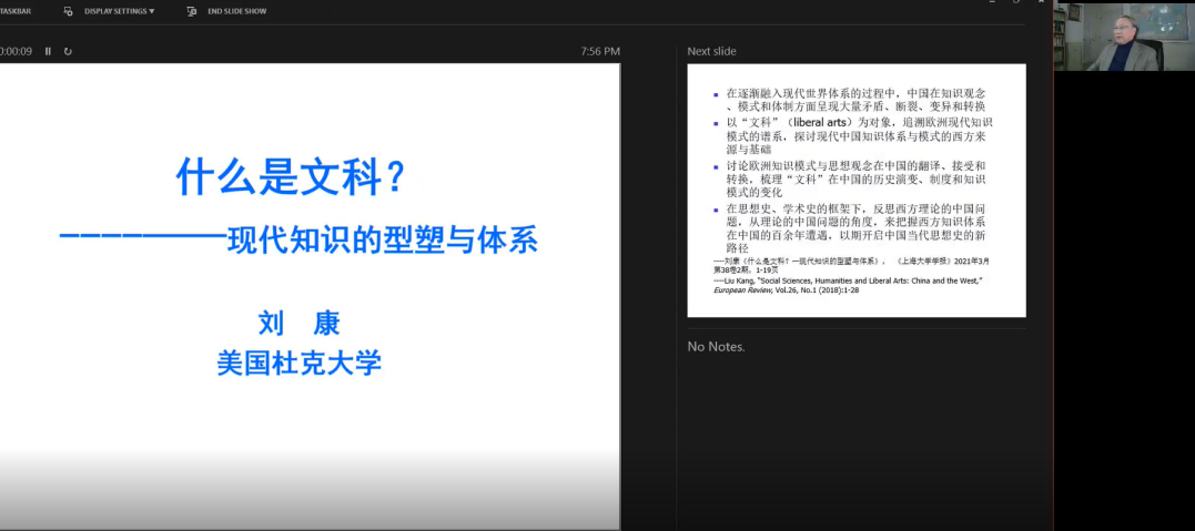 12月18日上午,欧洲科学院外籍院士、美国杜克大学中国研究中心主任刘康教授受邀为南航师生做了题为“什么是文科?——现代知识的形塑与体系”的线上讲座。本讲座由国际合作处和外国语学院共同组织。外国语学院327设置线下会场,线上线下同步进行,共有100多位师生参加,讲座由外院副院长姜礼福和学院国际交流中心主任刘世红联合主持。