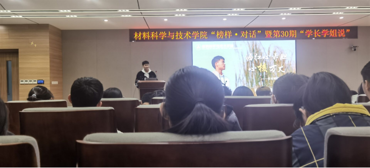 为帮助同学们完成自我的大学生涯规划,获得一个有所收获与成长的大学生活,12月17日,材料科学与技术学院“榜样·对话”暨第30期“学长学姐说”活动在材料科学与技术学院院楼B501报告厅举行。本次活动邀请到了理学院校长特别嘉奖获得者董诗驰同学及材料科学与技术学院校长特别嘉奖获得者屈政哲同学分享他们在大学期间的成长经历。19、20、21级部分同学共同参与此次分享会。
