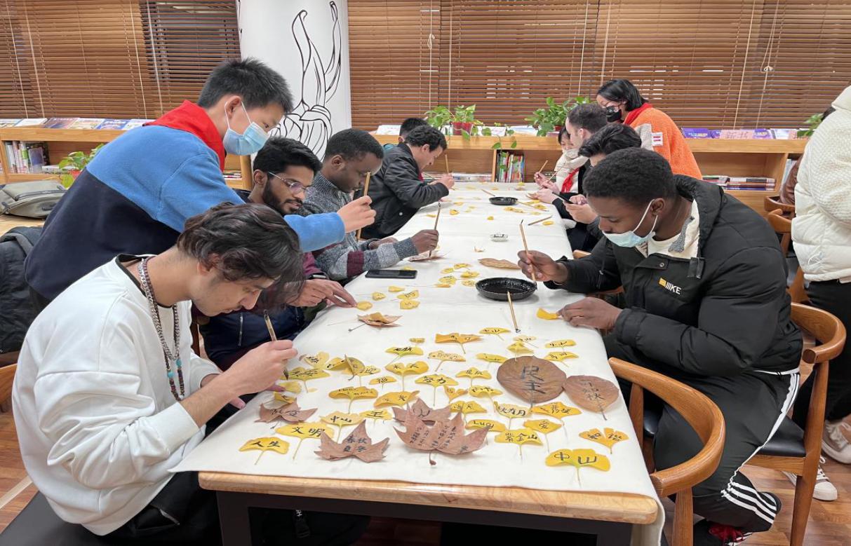 中外学子共同参观了国际文化展,互相交流各国文化;中山小学的同学们表演了优美的中国舞蹈,让留学生们领略了中国舞蹈的艺术魅力;留学生们还学习了用毛笔在树叶上书写汉字并表达了浓厚的兴趣,纷纷与自己的作品合影留念。