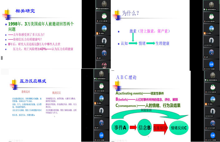 随后,杨雪花通过展示相关调查研究,表明认知是可以改变一个人的生理健康和心理状况的,进而告诉同学们不同的认知及心理感受,造成的结果是截然不同的,更新了同学们对“认知”重要性的看法。