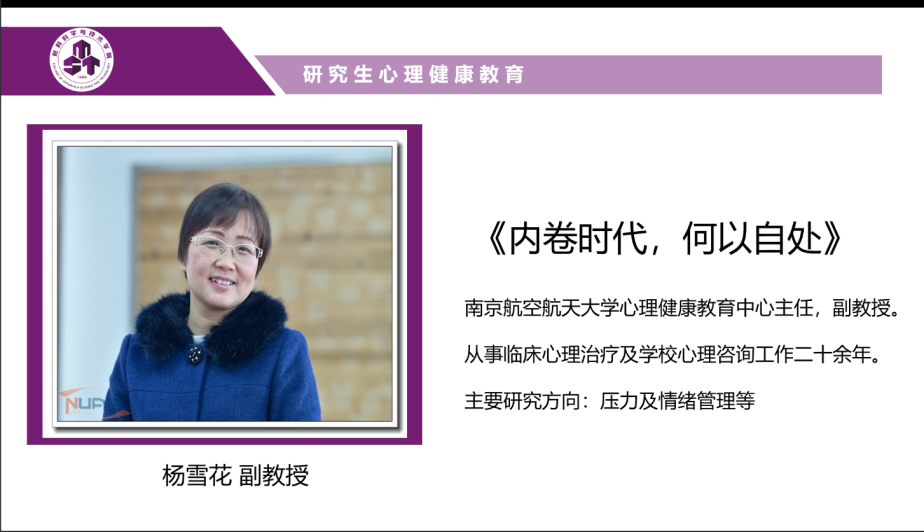 为帮助研究生新生改善心理机能,培养良好的心理品质,塑造健全的人格,学院紧密结合研究生特点及研究生培养需求,综合考虑疫情防控常态化要求,于2021年12月20日晚,开展以“内卷时代,何以自处”为主题的心理健康教育讲座。讲座邀请我校心理健康教育中心主任杨雪花任主讲嘉宾,2021级全体研究生参加。本次讲座由辅导员邱禄芸主持。