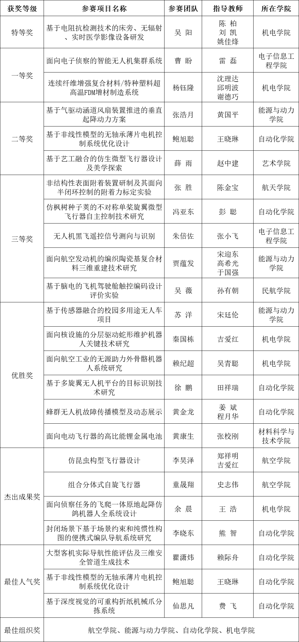 竞赛组委会还评选出最佳组织奖4项,并根据现场微信投票结果评选出最佳人气奖3项,产生3位最佳大众评审,予以了奖励。经过一年时间的精心培育,本次竞赛中有4个培育项目的相关成果获得了“飞鲨杯”未来飞行器创新大赛二等奖和最佳实物演示奖等奖项,充分体现了本项赛事对我校研究生创新实践能力培养的积极作用,被授予杰出成果奖。