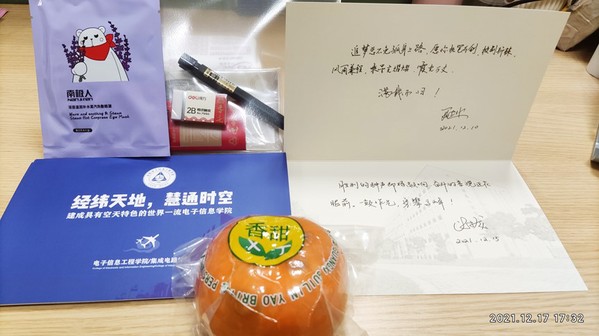 紧接着,老师为考研学子送上了学院特制的 “加油大礼包”,包括考场上需要的文具、缓解疲惫的蒸汽眼罩以及寓意着事 事如意的柿子。最特别的是,每一位考研学子都收到了由学院精心设计的祝福卡片,上面印着学院党委书记聂东林及常务副院长潘时龙亲笔为每位学子写的专属祝福语,希望考研学子执笔为剑,披荆斩棘,一鼓作气,永攀高峰!