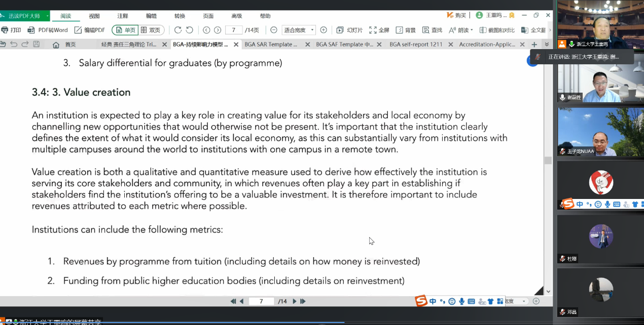 学院党委书记苏州首先对王重鸣教授的指导表示热烈欢迎和衷心的感谢。副院长王子龙汇报了BGA认证工作开展情况,目标是通过国际认证,以评促建,全面对标一流商学院。学院领导高度重视认证工作,针对BGA&AMBA联合认证,学院院长、党委书记牵头成立认证工作委员会。2021年1月学院正式提交认证申请报告,成为BGA会员院校,在国际化战略道路上迈出了坚实的步伐。在教师们的共同参与下,2021年底完成自评估报告,认证工作稳步推进。学院通过BGA认证CIM模型指标体系的构建,在学术科研、人才培养、师资建设、校企合作、校友贡献、价值创造、社会贡献等方面取得了显著成效。根据CIM模型指标体系,学院将进一步对工业工程、MBA、管理科学与工程等专业的课程教学大纲持续改进,在课程改革创新等方面不断探索。
