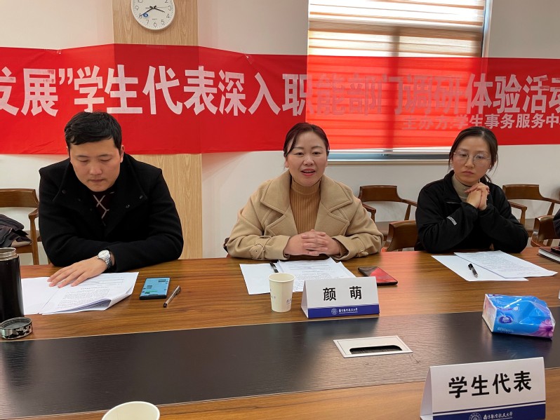 12月22日下午,学校学生事务服务中心联合学生会、研究生会等学生社团来后勤集团调研,召开“回首·共话·发展”座谈会。后勤集团副总经理颜萌,相关中心(部门)负责人参会。会议由颜萌主持。