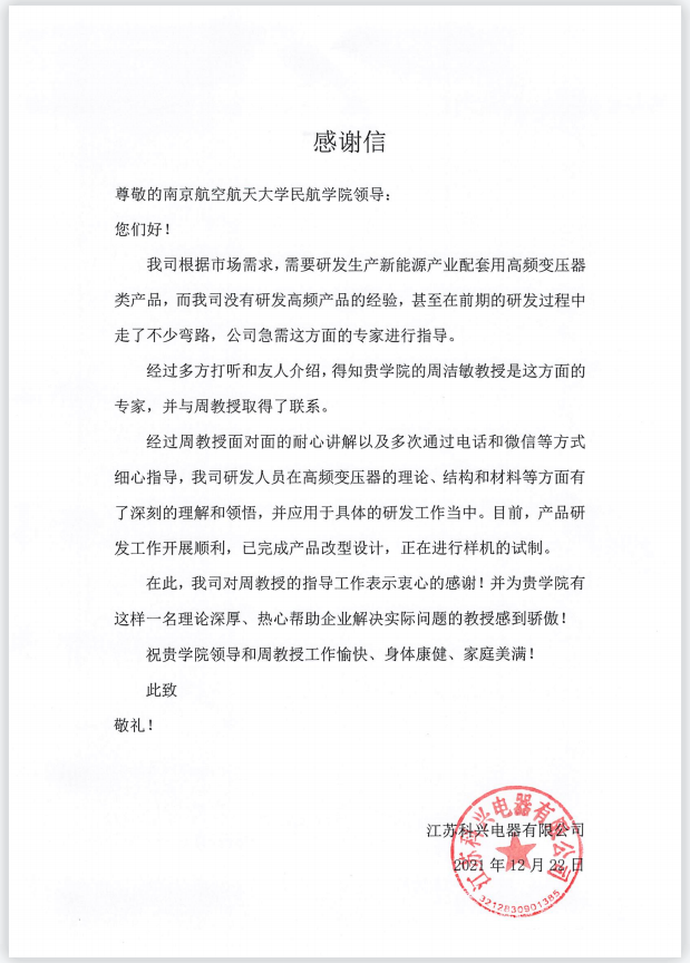 近日,江苏科兴电器有限公司发来感谢信,感谢民航学院教授周洁敏在其研发新能源产业配套用高频变压器类产品提供了指导与帮助。