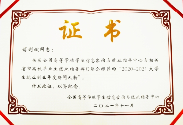 近日,全国高等学校学生信息咨询与就业指导中心公布了“2020-2021大学生就业创业年度新闻人物”评选结果,来自全国25个省(自治区、直辖市)的25名毕业生入选,我校电子信息与工程学院/集成电路学院2021届博士毕业生傅剑斌成为江苏省唯一一名获此殊荣的高校毕业生。