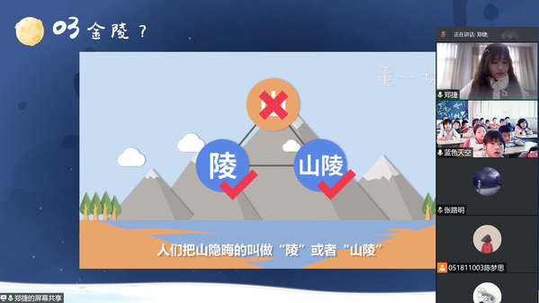 为助力脱贫攻坚成果巩固提升,12月17日下午,机电学院2018级本科生党支部与贵港市大上小学2019级的同学们通过腾讯会议的方式,开展“云端筑梦 护航未来”线上授课——第四期“话金陵•画金陵”主题课。本次线上授课内容分为金陵美食、旖旎风光、历史文化三个部分,郑捷同志担任授课主讲人。