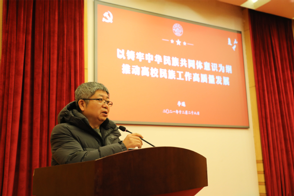 本期学习会由理学院和经济与管理学院承办。会上,李遥领学习近平总书记关于民族工作的系列重要讲话精神,他系统梳理了党推动我国民族团结进步事业取得历史性成就的历程,以史为鉴深刻论述民族工作的重要性;从坚持“十二个必须”、以铸牢中华民族共同体意识为“纲”、正确把握“四组关系”等维度,深入阐述了习近平总书记关于加强和改进民族工作的重要思想;并从我校创建“铸牢中华民族共同体意识教育实践活动江苏省试点高校”为切入点,就以铸牢中华民族共同体意识为纲,推动高校民族工作高质量发展提出要求。