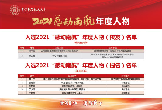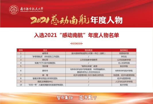 获评2021“感动南航”年度人物(含团队)和2021“感动南航”年度人物(提名)的名单如下: