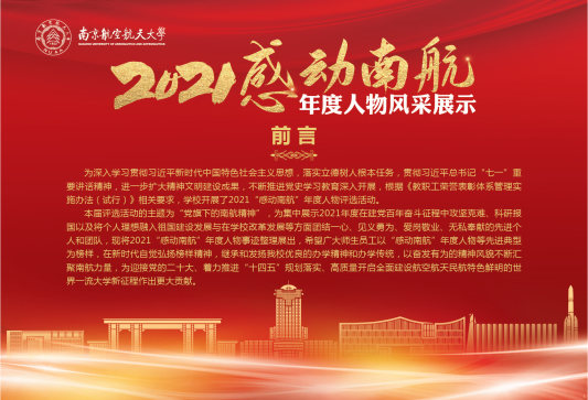 1月上旬,我校2021“感动南航”年度人物评选工作全部完成,共评选出2021“感动南航”年度人物10人(含团队)、2021“感动南航”年度人物(校友)2人,2021“感动南航”年度人物(提名)5人。本届评选活动自去年11月启动,评选主题为“党旗下的南航精神”,通过“感动南航”年度人物评选,展示在建党百年奋斗征程中攻坚克难、科研报国,将个人理想融入祖国建设发展与在学校改革发展等方面团结一心、见义勇为、爱岗敬业、无私奉献的先进个人和团队。