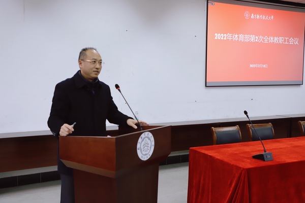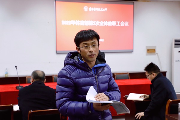 2月18日下午,在我校明故宫校区体育部四楼会议室召开全体教职工新学期第一次工作会议。党总支书记袁贵平,主任陆森召,副主任杜长亮、周保辉以及全体教职工参加了此次会议。会议由陆森召主持。