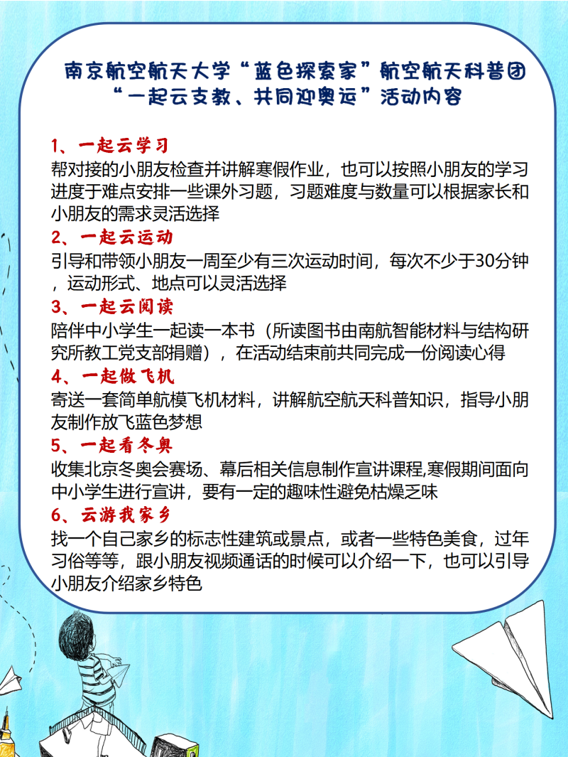 2021年12月,由团中央青年发展部作为支持单位,中国光华科技基金会与共青团北京市委员会联合主办的“青春爱运动 健康强中国 一起云支教 共同迎冬奥”全国大学生2022年寒假“返家乡”社会实践专项活动正式开启。南京航空航天大学“蓝色探索家”航空航天科普团的大学生志愿者们一呼百应,与贵州安顺市平坝区黎阳学校、四川省乐山市犍为县大兴中心小学的小同学们“大手牵小手”结对。这个寒假,他们“一起云运动”、“一起看冬奥”、“一起云阅读”、“一起做飞机”、“一起过个冬奥年”。