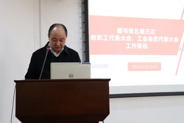 馆长袁家斌代表图书馆党总支和行政向大会报告2021年图书馆建设发展情况以及2022年工作思路。他从党建和思想政治工作、疫情防控工作、科学谋划“十四五”规划、天目湖校区分馆建设、智慧图书馆建设、“国家知识产权信息服务中心”成功获批、图书情报专业学位点获得增列、一年来主要服务数据与荣誉等八个方面系统总结2021年图书馆建设发展情况,并对图书馆全体馆员一年来的辛勤付出表示感谢;对于2022年的重点工作,袁家斌指出:图书馆需要在提高馆藏质量、扩充“资源”内涵、提供各类信息服务等方面为学校的教学科研工作提供更好的支撑和保障。要抓实抓牢党建工作、加快推进天目湖校区新馆建设、持续推进智慧图书馆建设、开启高校知识产权信息服务中心建设新征程、着力构建图情人才培养双通道模式,提升图书馆整体服务能力、服务质量和服务效益。