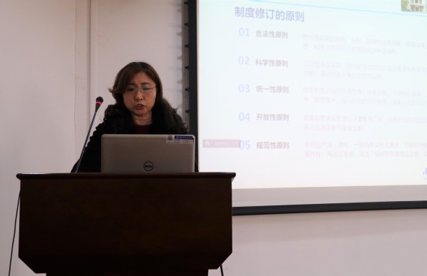 副馆长刘丽琳就图书馆管理制度修订说明做了专题报告。她首先介绍了制度建设工作的背景,指出图书馆规章制度是图书馆管理的依据,只有建立健全图书馆的规章制度,才能使图书馆的工作有章可循。她介绍了制度修订原则与进展,指出制度修订必须遵守合法性、科学性、统一性、开放性、规范性原则;随后,她对具体修订的制度做了详细介绍,图书馆目前共修订11项规章制度,新定2项管理办法,废止6项管理制度。