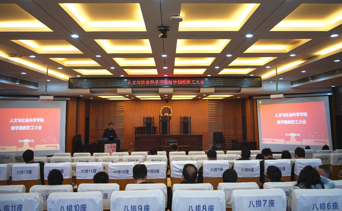 2022年3月2日,人文与社会科学学院召开了新学期全院教职工大会,传达学校党委重要会议精神,并对2022年学院重点工作进行部署。会议由院党委书记楚广兴主持,全院教职工参加会议。