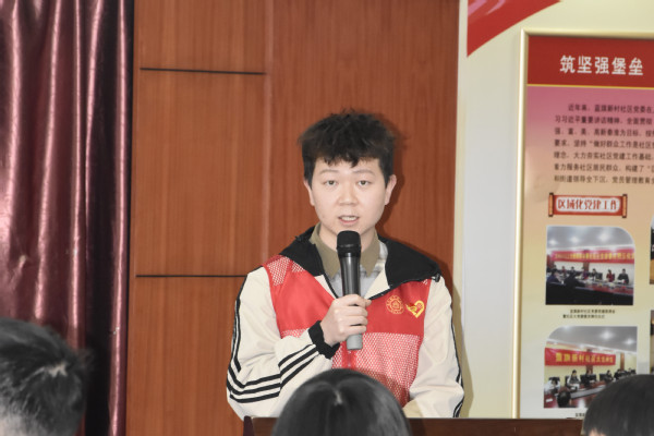 梁晔介绍了“幸福蓝旗”党建项目品牌,讲述了与南航志愿者的合作渊源。学院学生志愿者代表、“夕阳如画,定格幸福”实践团队队长李少阳深情回顾了近两年学院在蓝旗社区开展的“夕阳如画,定格幸福”金婚纪念、“蓝精灵少儿驿站——梦想雏鹰”、航空航天科普讲座、日常入户宣传等各类志愿活动,并就参与志愿服务以来的收获和成长谈了认识和思考。
