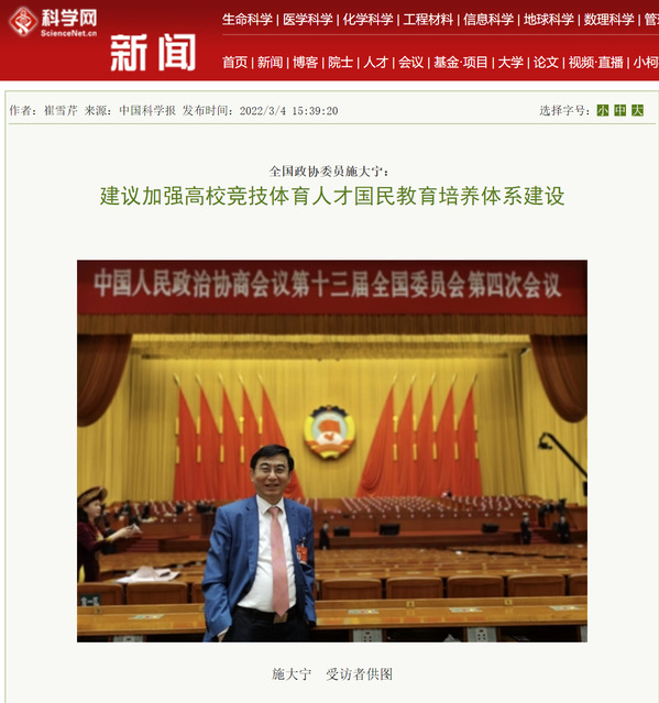 编者按:3月4日,《中国科学网》专访全国政协委员、副校长施大宁,就加强高校竞技体育人才培养,施大宁提出“国家层面建立统一的青少年体育教学、训练和竞赛体系”“‘一体化设计、一体化推进’各类体育赛事”“将竞技体育后备人才培养纳入国民教育体系,推动中等体育运动学校和业余体校转型发展”三点建议。现转发全文报道如下: