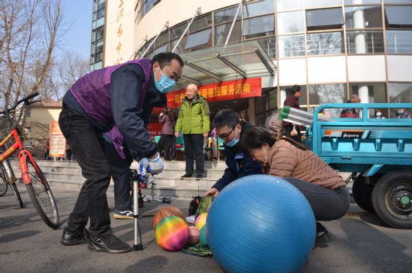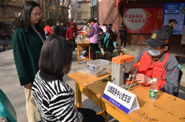 春暖花开的三月,便民服务活动现场气氛热烈。水电与维修服务中心党支部为居民提供免费上门维修服务,维修师傅进家门,为高龄老人解难题受到称赞;校园服务中心党支部提供家庭绿植养护方法咨询、固话线路维修服务;物业管理中心党支部的师傅维修自行车十余辆,现场提供免费血压、血糖检测服务,深受老同志欢迎;公寓服务中心党支部专门把钥匙配制机带到现场,为居民免费配钥匙三十余把;幼教中心党支部提供秋季招生、学前教育现场咨询;饮食服务中心党支部准备了质优价廉的熟食,并邀请经销商直接以成本价在西苑贩售猪肉以及新鲜水果,方便西苑住户;饮食服务中心党支部与接待服务中心党支部提供的磨刀服务,四名师傅轮番上阵,全天为居民免费磨刀近二百把。