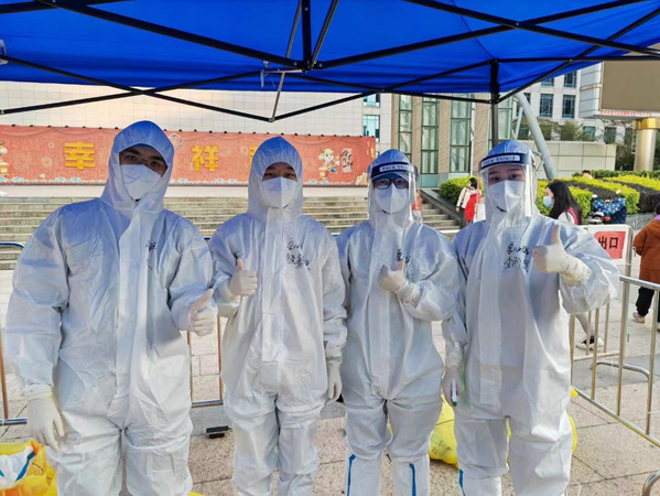 核酸检测工作从早上8点开始不间断至晚上,志愿者和医护人员们便要提前一个小时到场布置场地,张立人同学也积极参与其中,他帮助工作人员搬桌子,布置太阳伞,拉警戒线,几乎所有零碎的工作都做过。检测工作开始后,他便穿上防护服,拿起手机给群众录用信息,由于人员的匮乏,穿上防护服后,他要一连工作四个小时,期间不能上厕所,不能吃东西。虽然条件艰苦,但他仍旧没有任何怨言。