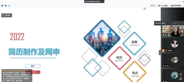 3月16日晚,“求职能力提升训练营”第一讲“网申及简历制作”顺利开讲。本次课程采用在线直播的形式,特邀我校校友、资深人力资源专家、OPPO 华东区域人力资源负责人葛玲主讲,在线观看人数超过500人。