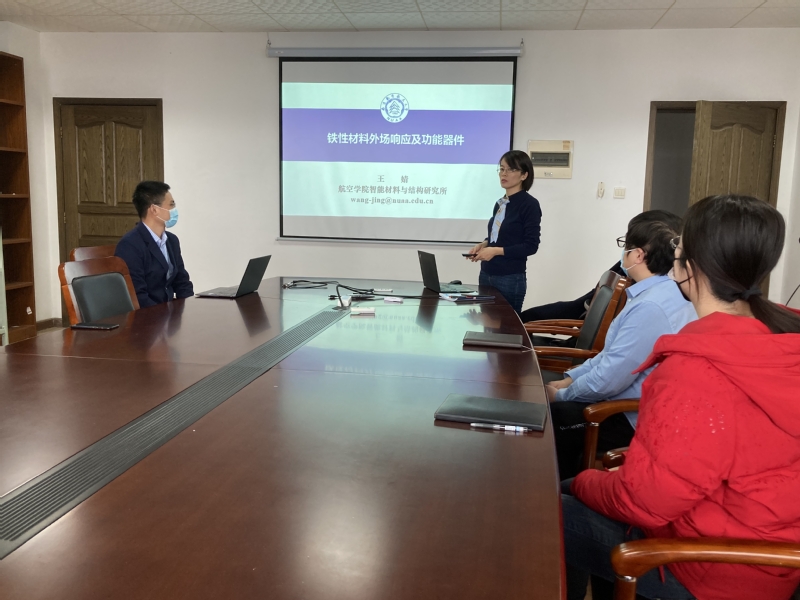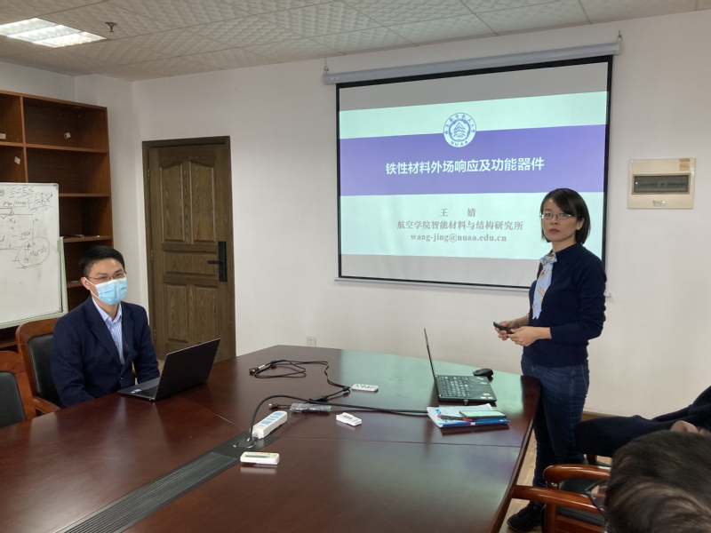 航空学院王婧教授以“铁性材料外场响应及功能器件”为主题,介绍了铁性材料在电子器件和能源领域的应用现状和前景,并详细分享了其在基于铁性材料的电介质电容器储能应用研究方面的最新进展和突破。王婧教授利用水热法突破了难以用硝酸银合成纯相铌酸银粉体的限制,解决了尺寸可调的纯相铌酸银粉体关键技术,得到的击穿场强达到了纯相铌酸银陶瓷的最大值,同时通过“介-微-纳”多级尺度的协同调控新思路,实现了储能性能的协同优化。王婧教授还同线上和线下的与会教师和学生开展了深入交流,就铁性材料的间隙原子掺杂、铌酸银性能提升机理、梯度结构制备等问题进行了的讨论,为进一步开展深入的学科交叉打下了基础。