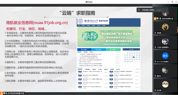接着,余珂欣就就业问题作出讲解。她通过“把握应届机会”、“工作如何选择”、“简历怎么准备”、“面试小技巧”、“怎样看懂岗位”、“寻找工作建议”、“国防就业”等方面详细阐述了如何找到一份满意的工作;签约方面,她通过实际操作为学生分享了签约流程及签约平台如何使用,解答了学生们各式各样的问题。