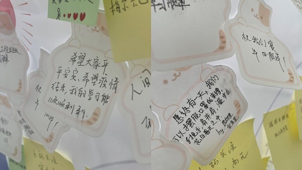 留言板上数十条留言勾勒出疫情期间同学们的美好祝愿和生活热情。既有“希望大家平平安安,疫情早点结束”,“手挽手,肩并肩,漫步在花与春天之中”这样的美好祝福,又有“我想吃汉堡”、“早日脱单”之类的朴素愿望,还有“门卫叔叔、食堂阿姨你们辛苦了”等对疫情期间工作人员的感谢。