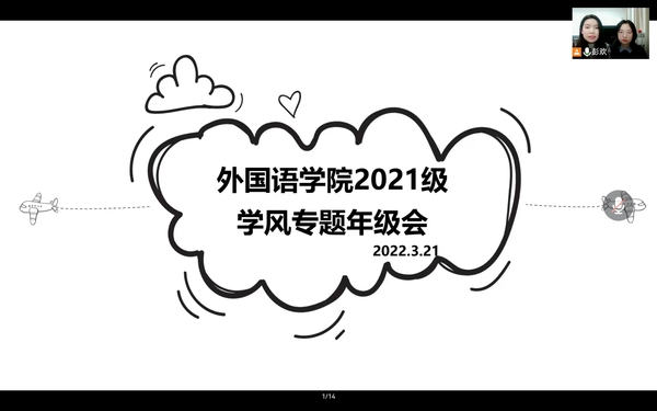 为调动同学们的学习积极性,营造更好的学习氛围,回顾总结上学期的学业成绩,3月21日下午,外国语学院2021级全体本科生于线上开展学风专题年级会暨“学业攀登计划”启动仪式,会议由辅导员彭欢和兼职辅导员曹文清共同主持。