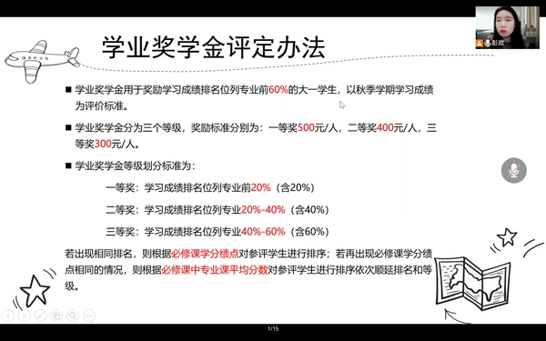 接着,彭欢向全体同学详细解读了《外国语学院学风建设本科生学业攀登计划》的实施背景和积极意义,从针对群体、实施方案、奖励方法这三个方面进行介绍,鞭策学业较为落后的同学要依托学院学风建设平台规划自我、努力攀登;并鼓励学业较好的学生积极报名成为朋辈学业伴读导师,辅导并帮助其他同学积极学习与生活。同时,她鼓励各班以班级为单位进行学海同舟计划,各班级成员积极参与、互相帮扶,鼓励班级学生干部发挥其模范带头作用,以促进班级集体的进步。