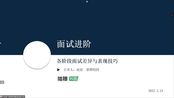 3月24日晚,2022年“求职能力提升训练营”空中课堂第三讲“结构化面试”正式开讲。本次课程是“求职能力提升训练营”空中讲堂系列课程的最后一讲,课程沿用线上直播的形式,由猎聘校园-高校关系总监、就业指导活动讲师凌波主讲。