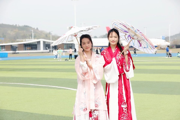 除了风筝,同学们还进行了手绘油纸伞,京剧脸谱、宇宙飞船等画面跃然展现在古朴怀旧、精致唯美的油纸伞上。穿着汉服的姑娘们撑着油纸伞,宛若丁香一样,一开一合间,尽展温婉的东方诗情。