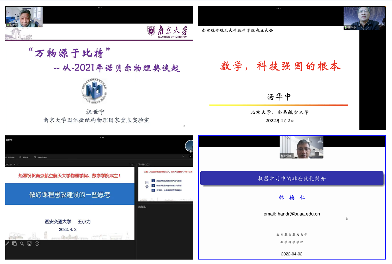 揭牌仪式后,王春武主持了学术交流环节,中科院院士、南京大学物理学院教授祝世宁,西安交通大学原常务副书记、物理学院教授王小力,南昌航空大学副校长(挂职)、北京大学数学科学学院教授汤华中,北京航空航天大学数学学院院长、教授韩德仁等数学和物理研究领域专家围绕基础学科发展等在线作精彩报告并深入交流研讨。