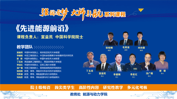 据毛军逵介绍,《先进能源前沿》是学校在国家构建“清洁低碳、高效安全”现代能源体系、实现“2030碳达峰、2060碳中和”能源战略目标背景下开设的通识性选修课程,以科教融合、产教融合的人才培养理念为指导,基于能源动力领域国际前沿最新科研进展,并结合教学团队近期主持的相关重大科研项目和取得的重要科研成果,主要讲述能源科学多学科交叉前沿的发展趋势以及空天能源动力技术的最新进展,帮助同学们了解世界能源问题现状,认识全球和我国能源变革方向,掌握先进能源转换、储存与利用技术的前沿交叉学科知识,以及相关技术在新型空天能源动力和推进领域的应用,通过研究性教学帮助学生构建先进能源技术知识体系。