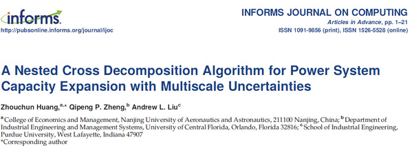 黄周春作为第一作者,与美国中佛罗里达大学工业工程系副教授Qipeng Phil Zheng、美国普渡大学工业工程系副教授Andrew Liu合作完成的研究成果《A Nested Cross Decomposition Algorithm for Power System Capacity Expansion with Multiscale Uncertainties》发表于《INFORMS Journal on Computing》。文章基于现代电力系统中日益增多的可再生能源、电力存储、电动汽车和各种需求测响应资源并网使用,给电力系统扩容规划和运营管理带来极大的不确定性和挑战。该研究为电力系统扩容问题开发了一种多阶段多时间尺度随机混合整数规划模型,能够同时捕获和处理决策过程中不同时间尺度的不确定性。