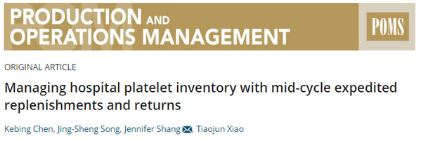 陈克兵作为第一作者,与美国杜克大学商学院教授Jing-Sheng Song、美国匹兹堡大学Katz商学院教授Jennifer Shang、南京大学工程管理学院教授肖条军合作完成的研究成果《Managing hospital platelet inventory with mid-cycle expedited replenishments and returns》发表于《Production and Operations Management》。文章基于中小型医院改善其血小板库存管理的需求,考虑了一个在有限时间内具有三个保质期的易腐产品的库存系统。在该系统中,每个定期补货周期补充了中期的库存调整机会,如追加订单和退货选择。结果表明,每周期初的最优订购可描述为一种新型的(s,S,S(x))库存控制策略,同时中期库存调整策略具备控制带的特征。