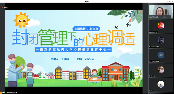 4月20日,在学校天目湖校区,心理健康教育中心组织开展主题为“封闭管理下的心理调适”的线上讲座。本次讲座由校心理健康教育中心教师王俊丽主讲,面向全体在校学生。讲座伊始,王俊丽以学校因疫情防控需要封闭管理以来,学校提出的各种规章制度以及辅导员们在校门口巡查时流露出担忧眼神等图片开篇,引出了封校管理以来同学们学习生活发生的各种变化,以及对此同学们可能出现的不同情绪。王俊丽细致分析了这些情绪背后的可能出现的原因,并进一步为大家介绍了七种调适方法,具体包括维持生活习惯、保持人际连接、掌握寝室沟通艺术、解锁“新技能”、以“小确幸”代替“不确定”、整合各类资源以及掌握情绪平复的方法。最后,王俊丽向大家推荐了江苏省大学生24小时心理热线、苏心APP以及南航心理驿站抗疫心理微讲堂等心理资源,并鼓励同学们在需要的时候积极利用身边资源,主动寻求帮助。