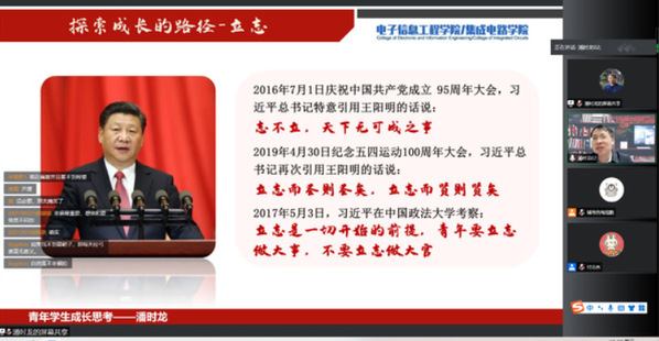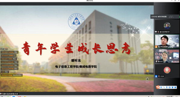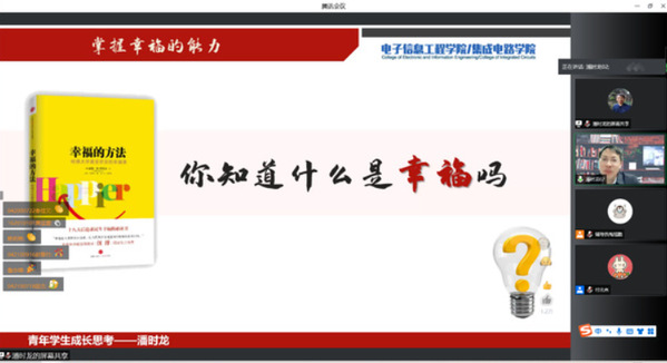 潘时龙围绕“幸福”和成长”两个主题,讲述当代青年获取幸福的能力、健康成长的方法。结合带领团队在科研过程中攻克困难的经历,用“励志、勤学、改过、择善”的路径解读成长的过程,在疫情之下,帮助青年学生形成对人生的正确态度,引领奋斗成长。
