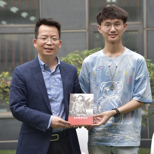 最后,刘宇雷向团支部赠书《习近平的七年知青岁月》。他表示,时年15岁的习近平总书记下乡7年,经过了“饮食关”、“跳蚤关”、“劳动关”、“思想关”的考验,同梁家河人民同甘共苦,并初步确立了人民至上的价值理念,我们要以总书记为榜样,胸怀理想、胸怀人民,在青少年这个拔节育穗期扣好人生的第一粒扣子。他倡导同学们把读书变成习惯,变成终生的爱好,读万卷书,行万里路,在书中体验生活、感受温暖,通过读书更多地了解世界、洞察世界;更要学会思考,用习近平总书记提出的六个思维来分析问题解决问题,争做有思想有态度的新青年。