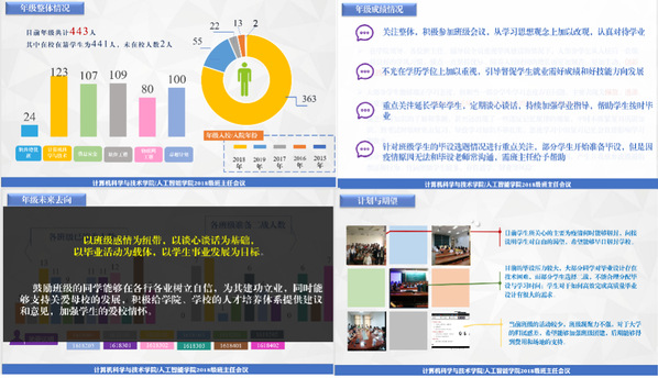 辅导员胡朋从学生成绩分析、未来发展和去向、疫情在校生活习惯、毕业季对班主任的期望四个方面进行汇报,介绍年级基本情况和当前问题,梳理了本学期相关工作的重要事项,希望班主任能够与辅导员形成育人合力,有针对性为学生提供指导和帮助。