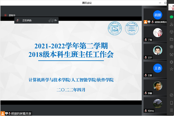 为做好高校服务育人工作,充分发挥班主任在学生成长成才中的引领作用,4月27日,计算机科学与技术学院/人工智能学院/软件学院顺利召开2018级本科生班主任线上会议。学院党委书记刘健荣、院长陈兵、党委副书记王宁、院长助理李鑫、教学办主任林卉、全体2018级本科生班主任、教务员、辅导员参加会议。会议由辅导员丁瑶主持。