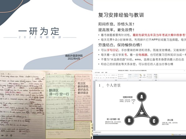 随着社会发展,考研大军也在不断壮大,很多同学也将考研纳入自身未来首选,针对如何备考,4月22日晚 “一研为定”考研经验分享会邀请了三位学姐为同学们答疑解惑。考入南航英语笔译专业的方菲从师资、个人情感等方面陈述选择南航的理由,并针对不同考试科目给出了相应的备考方法,并着重强调英语学科背诵单词的重要性;考入北航英语笔译专业的梁钰浛则详细介绍如何计算一个学校报录比及复录比,在备考科目中也给出了推荐的方法、老师、课程以及APP等;调剂至南京理工大学英语语言文学的甘雨珊首先分析了自己的性格,并依据自身特点安排了短时高效率的学习方法,她强调考研是一个长期战役,要时刻坚定信念,不要松懈。最后,在提问环节中,三位学姐就同学们提出的问题进行了细心解答。